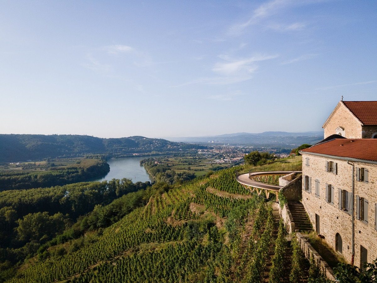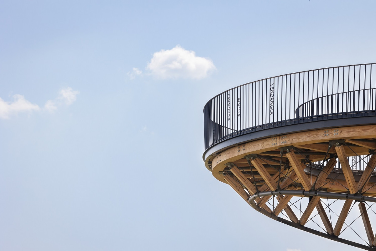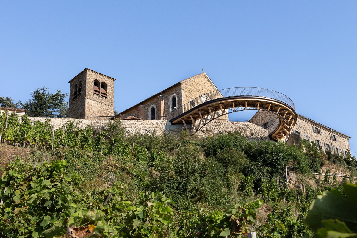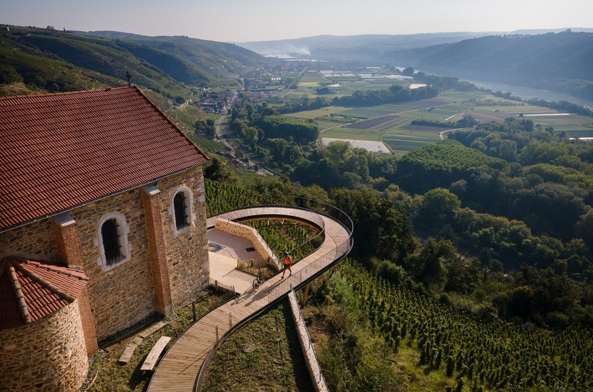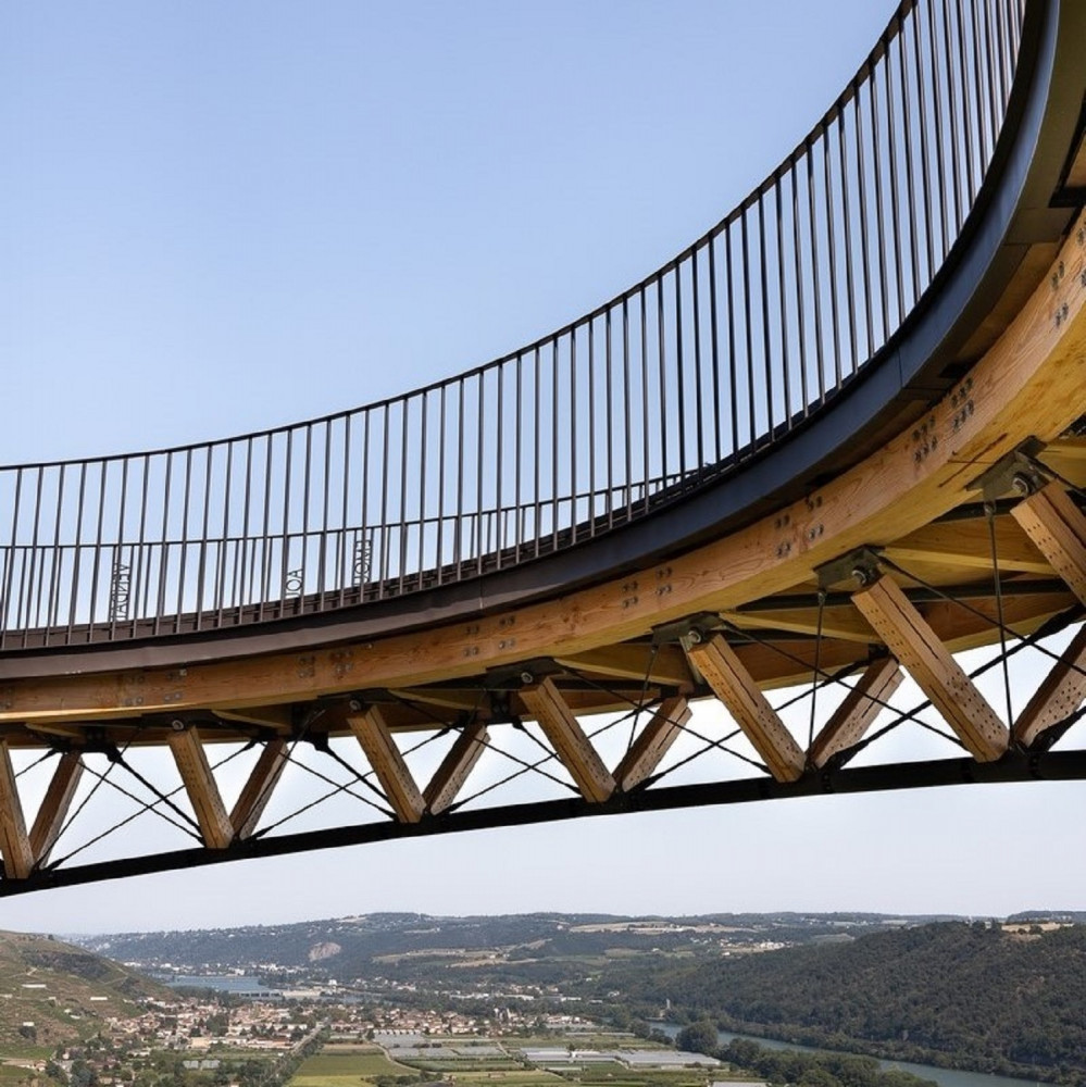 Cheminement en porte-à-faux semi-circulaire supporté par une structure bois et métal en triangulation 3D.