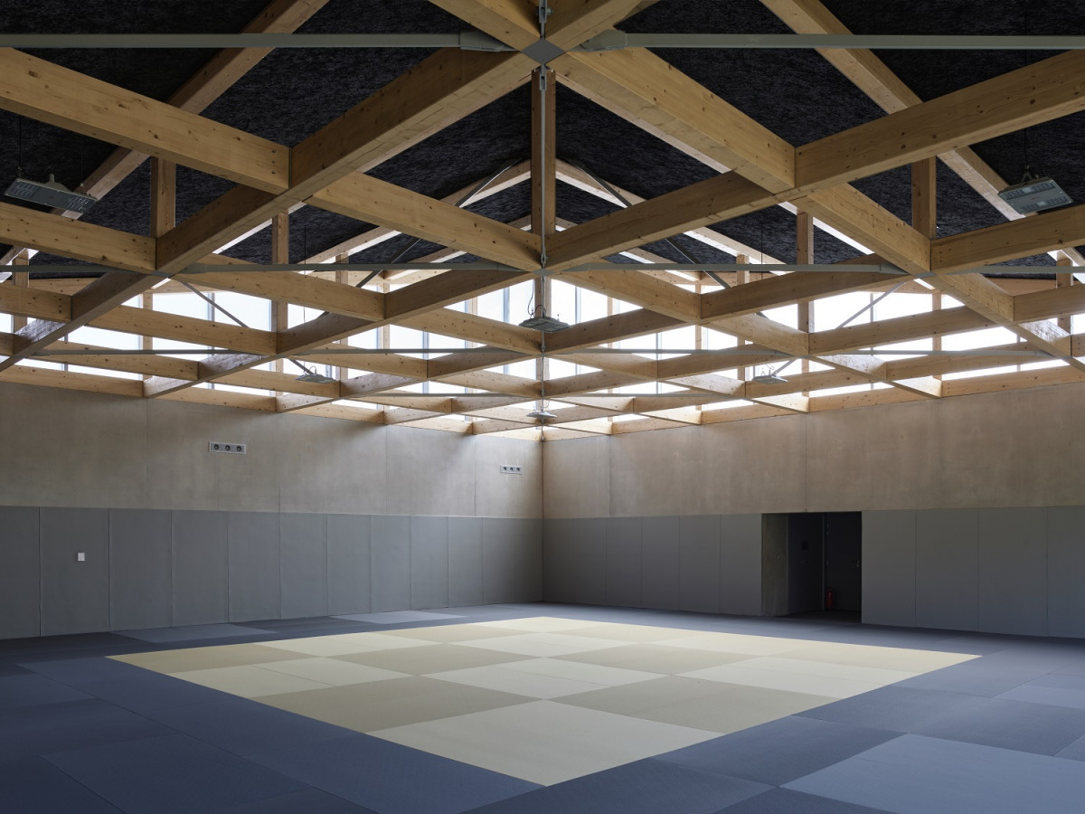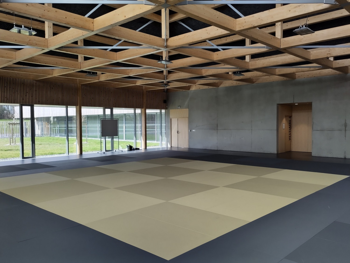 Dojo : une salle carrée de 16,8m de côté. La structure est composée d’une charpente bois tri-dimensionnelle sous-tendue en métal.
