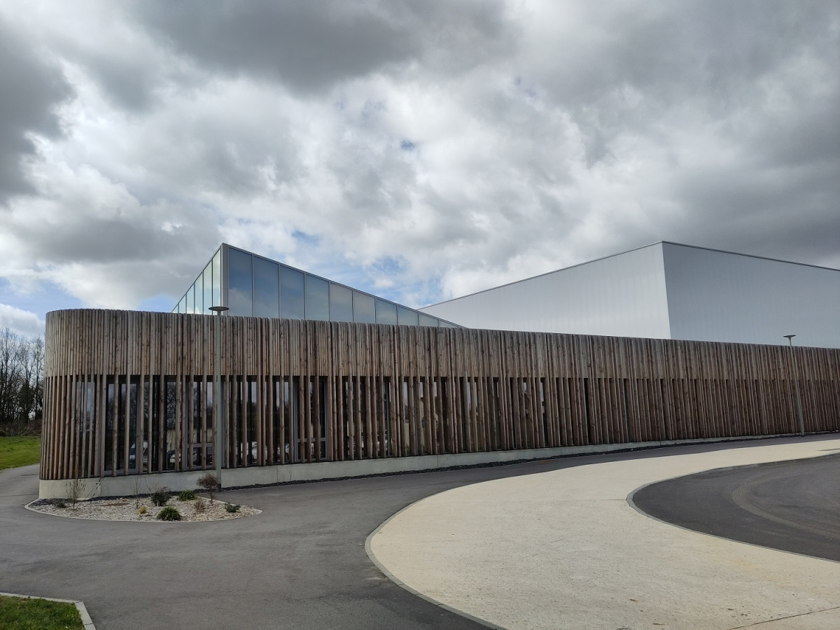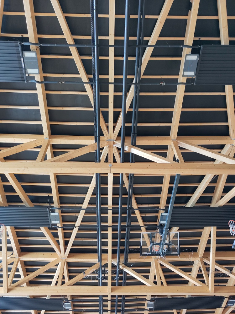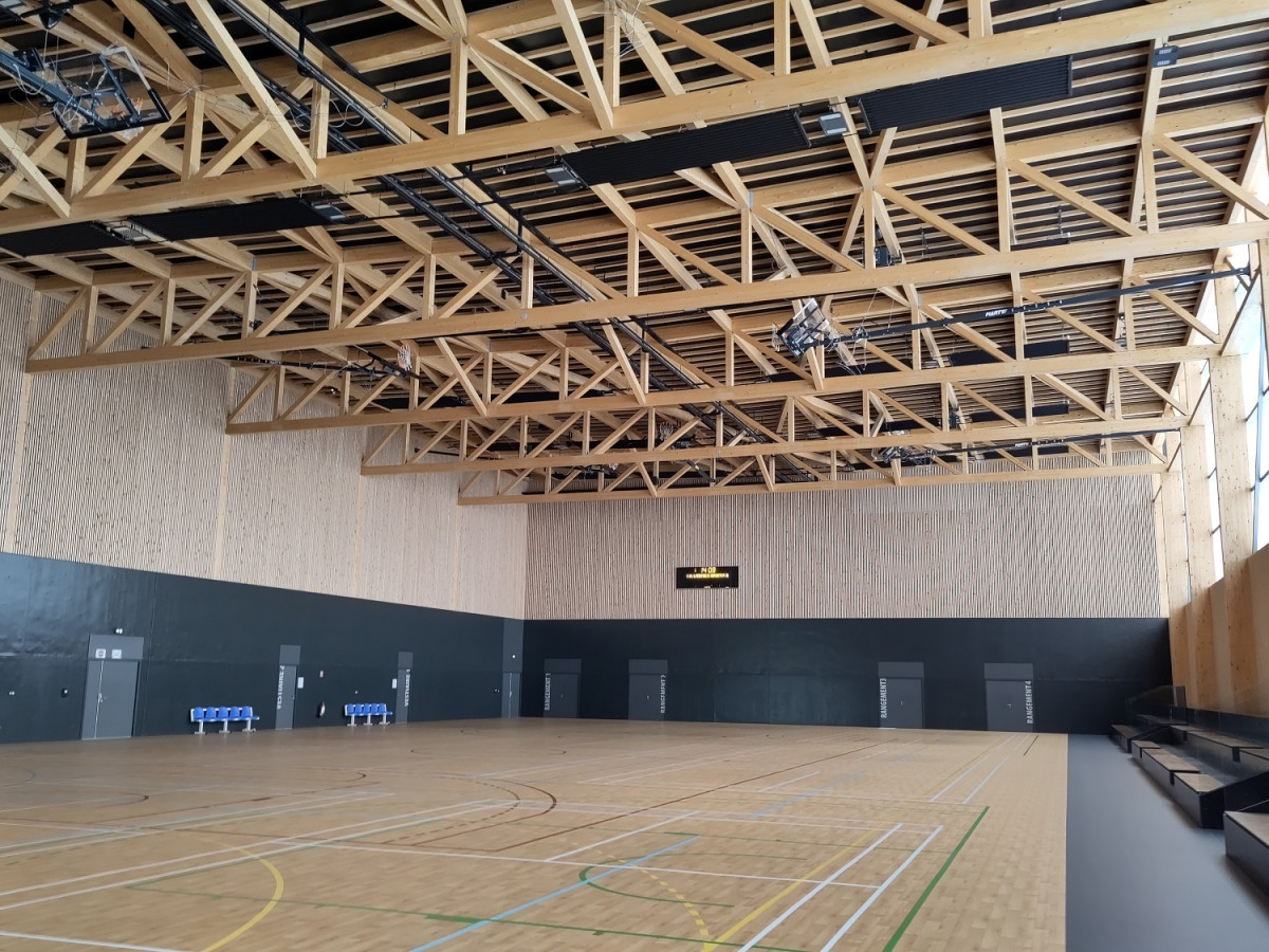 Gymnase : Charpente bois de type treillis tramée dans le sens de la longueur. Porte sur environ 28m dans la largeur de la salle et culmine à environ 12m. Soutenue par des poteaux bois qui se reposent sur 3 côtés sur un socle en Béton Armé.