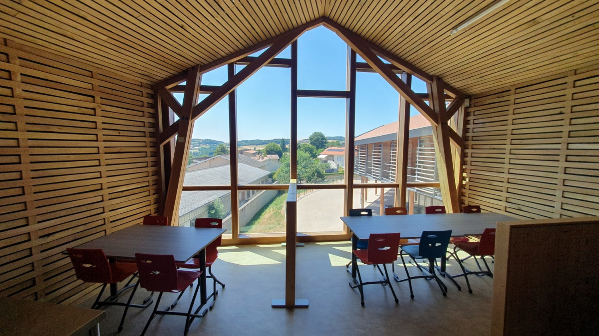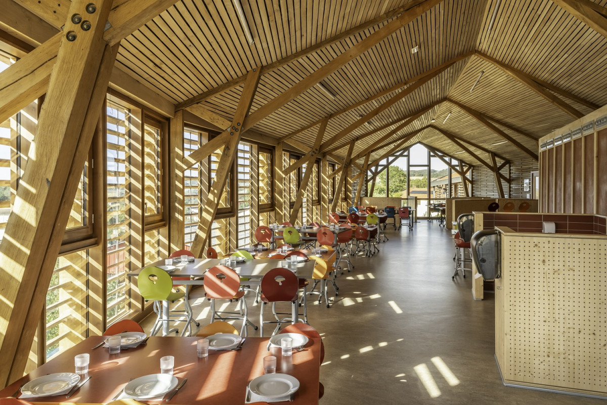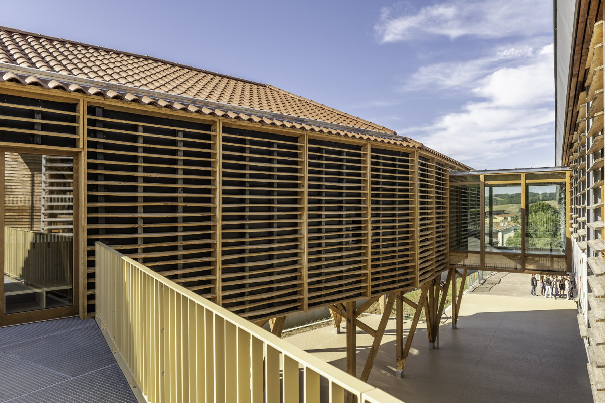 Les ossatures bois, planchers et toitures sont réalisées en caissons garnis d’isolant bio-sourcés et revêtus par des habillages originaux en châtaigniers, tressés en intérieurs et usinés en extérieurs.