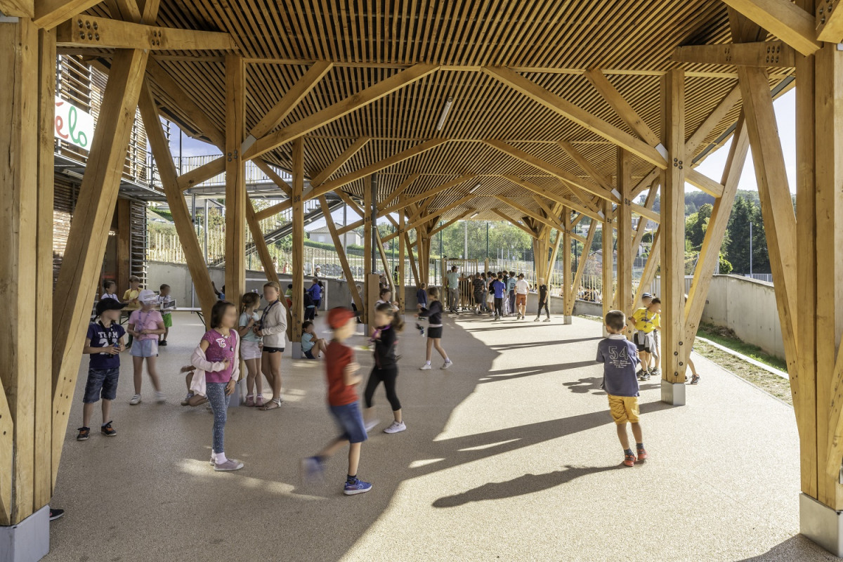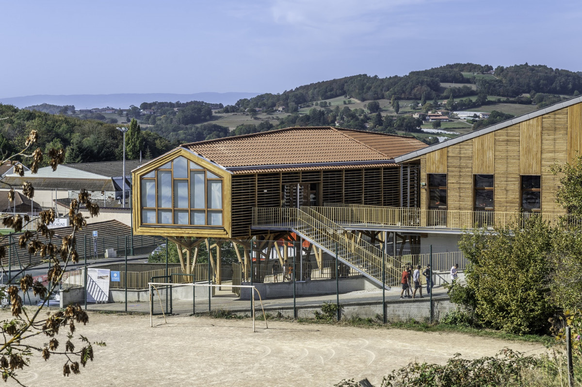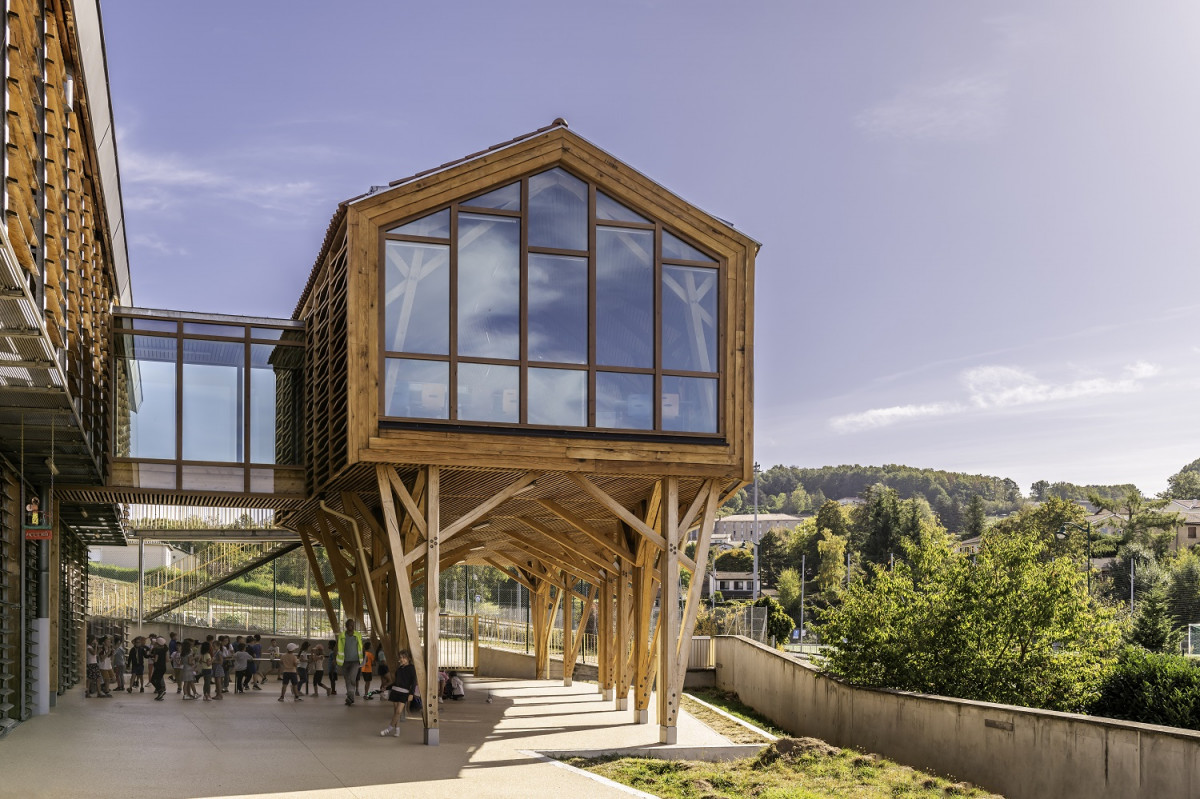 Des doubles portiques empilés, en chêne massif français, forment le squelette d’un bâtiment sur pilotis. Une géométrie complexe est réalisée par simple homothétie des portiques successifs.